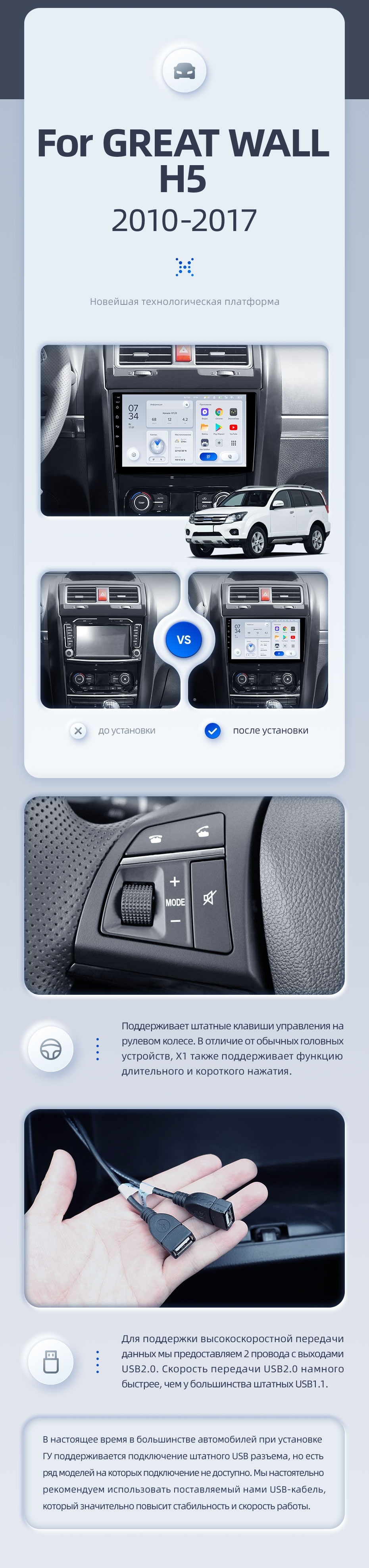 | USB | 3×USB 2.0 + USB 3.0 | Доп. аксессуары | Передняя/задняя AHD-камера, DVR-регистратор, TPMS, парковочный OBD, Type-C → HDMI |