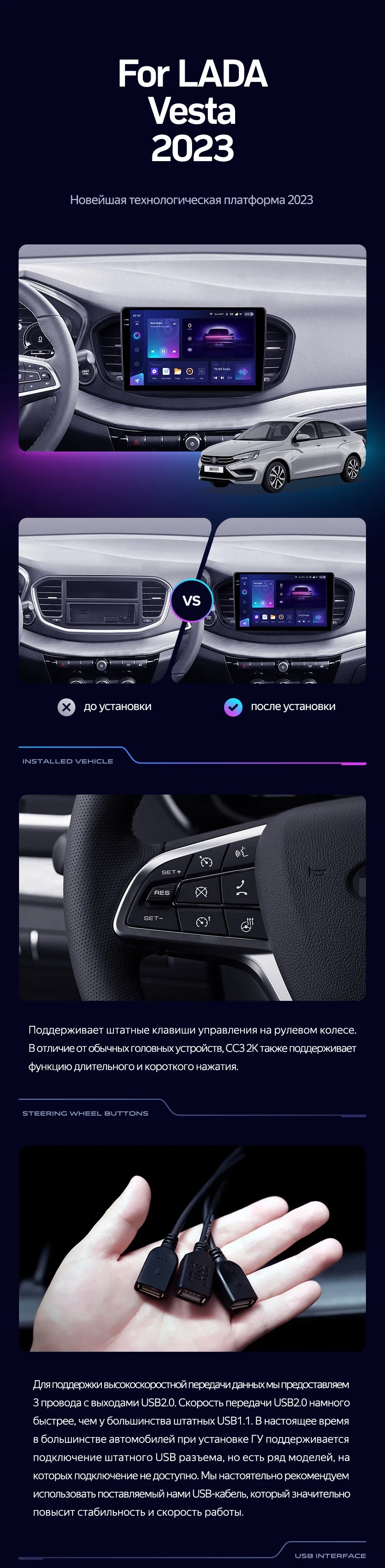 | USB | 3×USB 2.0 + USB 3.0 | Доп. аксессуары | Передняя/задняя AHD-камера, DVR-регистратор, TPMS, парковочный OBD, Type-C → HDMI |
