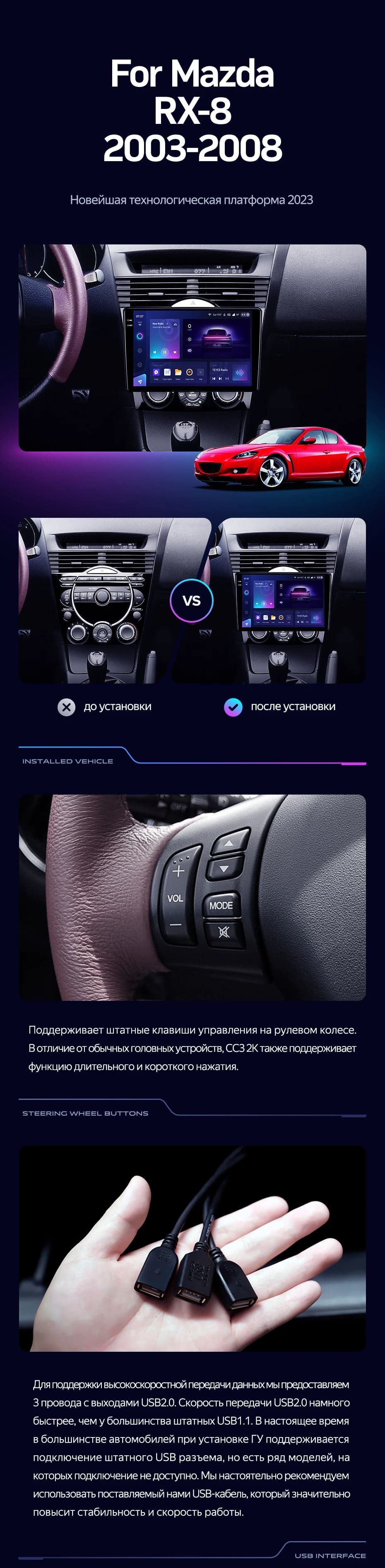 Полный комплект установки магнитолы Teyes с рамкой и проводкой можно выбрать в каталоге штатных магнитол Mazda RX-8 SE (2003-2008).