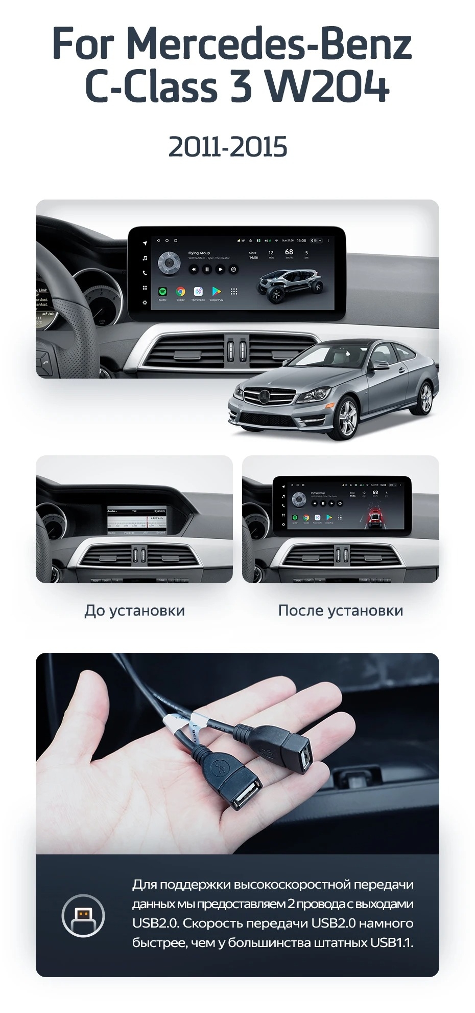 Установочный комплект для Mercedes-Benz C-Class 3 W204 C204 S204 (NTG 4.5) (2011-2015) включает переходную рамку и проводку.