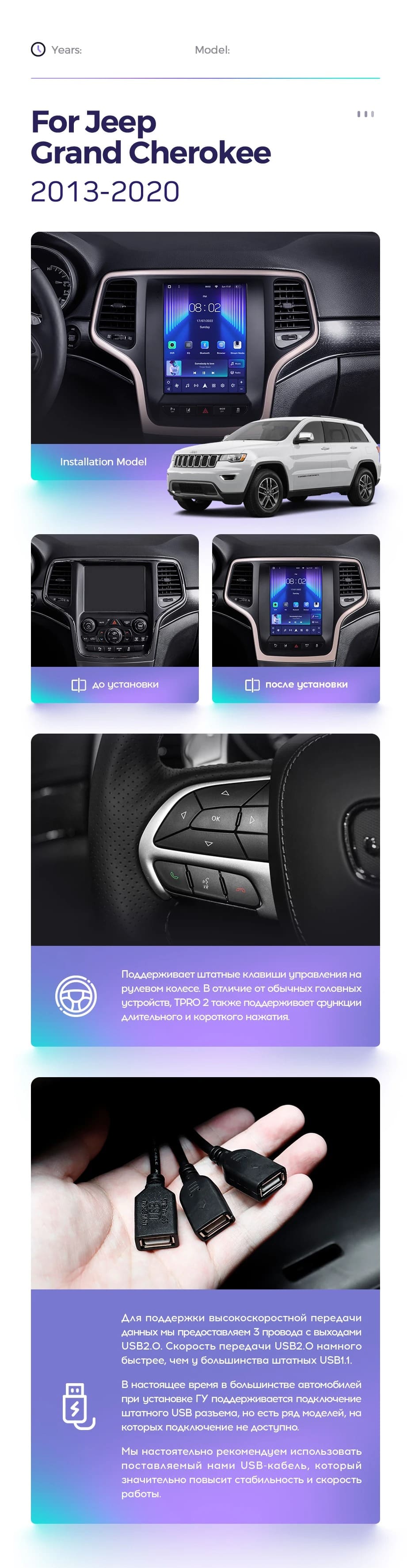 Полный комплект установки магнитолы Teyes с рамкой и проводкой можно выбрать в каталоге штатных магнитол Jeep Grand Cherokee WK2 (2013-2020).